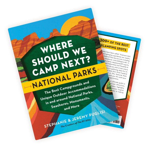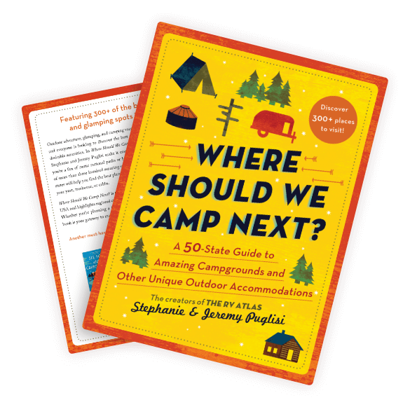 Stephanie Puglisi is the co-creator and frequent co-host of The RV Atlas podcast and the co-author of the bestselling and award-winning series of Where Should We Camp Next? Books. She’s also the co-author of RV Vacations. Stephanie earned her camping chops as a young girl setting up and sleeping in the family’s eight-man canvas army tent, but now greatly prefers her RV’s hot showers and comfortable beds. Her favorite places in the world include a winning combination of sand, sun, mountains, and water…plus a great book to read while visiting.