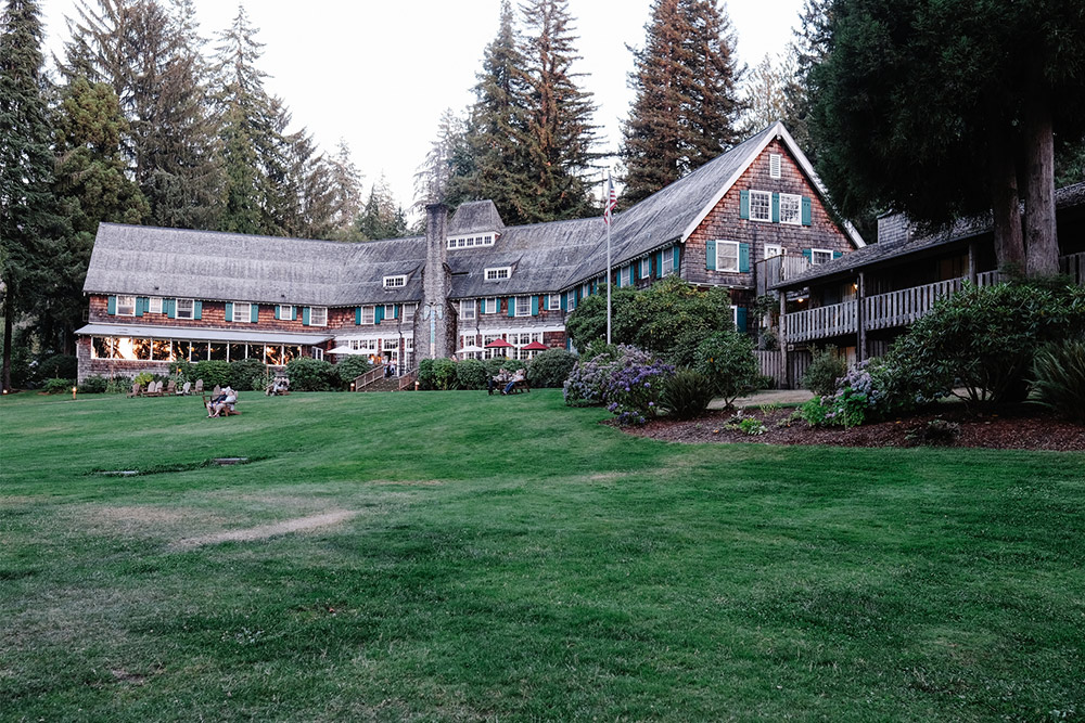 Located just outside of Olympic National Park, Lake Quinault Lodge is more remote and serene. Bryan described it as having a 1920s grandeur. The lodging is situated around the beautiful, placid Lake Quinault and dwarfed by massive trees.