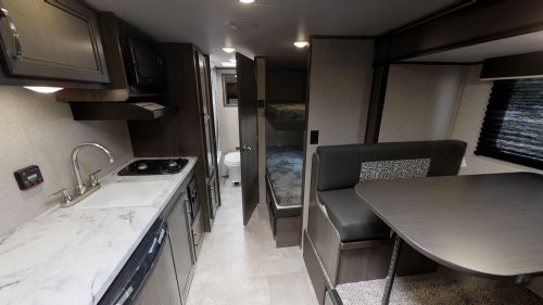 First up, let’s talk about one of the classic family starter trailers, the 2020 Jayco 184BS. Jayco has had several very similar variations of this floor plan over the years. It has everything you need to enjoy life at the campground, and nothing you don’t need. You’ll find a full kitchen, a bathroom, bunks for the kids, a small dinette, and a dedicated bed for the parents.