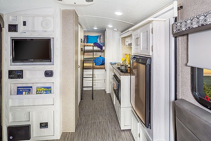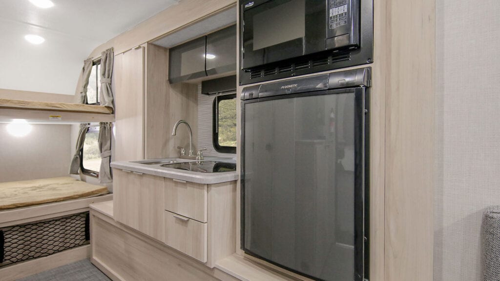 Of the lineup, the Hike H172BH is the only bunkhouse, so far. At the rear, you’ll find larger, wider bunks (often called “bunk-and-a-half” size due to the extra width). Each has a window, which is a nice touch. Adults will have to sleep on a fold-down U-shaped dinette.