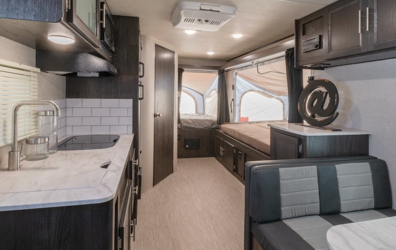 Beds are the star of the show in the 2020 Dutchmen Kodiak Cub 179E. This model has three 60” x 80” flip-out beds, which can sleep up to six. Fold down the interior dinette for space for two more to sleep. You really cannot find sleeping space for up to eight people for this length and weight without a hybrid!