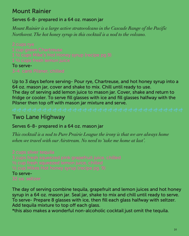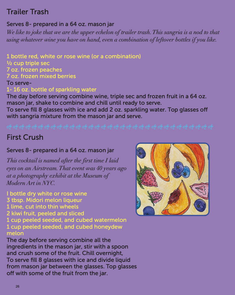 “Claudia Jack Sutton’s second book, Campfire Cocktail Hour, chalk-filled with over 120 appetizer and drink recipes, was designed with the Airstream and RV enthusiast in mind. Part cookbook, part “how-to,” you will learn time saving food pre-prep techniques, tips for stocking your bar, and enjoy countless recipes. So, whether your creating an intimate evening or entertaining a crowd, beginning with a drink named for an American National Park promises to set the mood and provide you with the necessary ingredients to make your rolling kitchen the envy of the campground.”