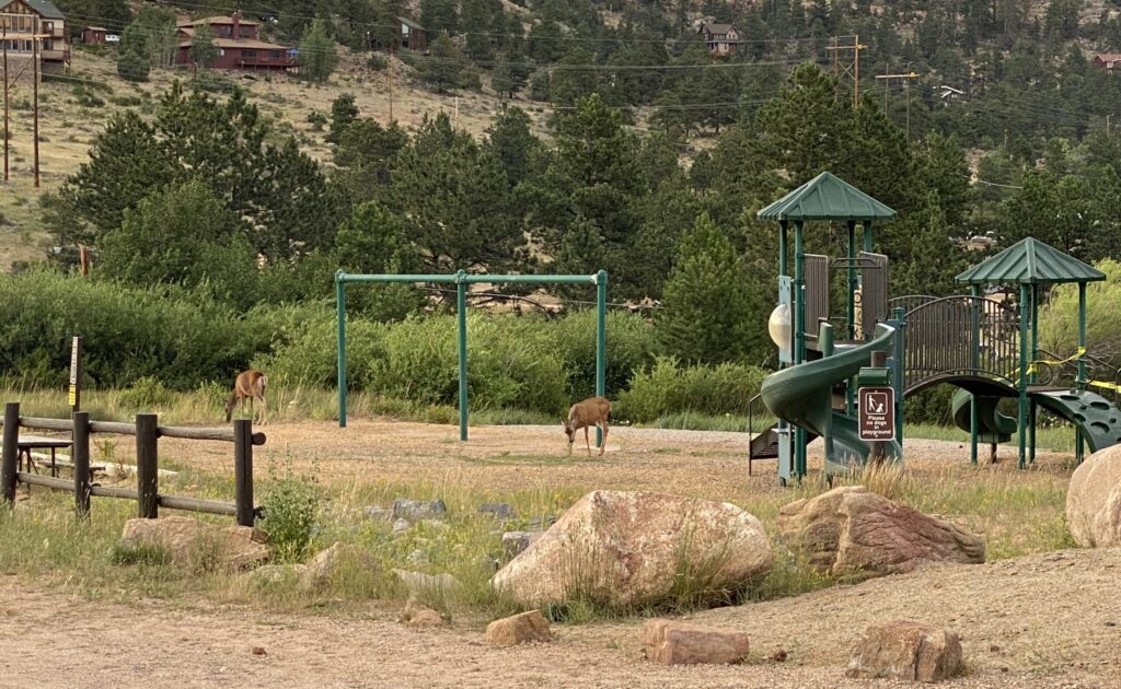 Kids can enjoy the small pool. It wasn’t opened while Kerri was there due to COVID-19. The weather is often below 60 degrees at night. The playground was also closed, but kids were having fun scrambling on nearby rocks while deer enjoyed the grass in the playground.