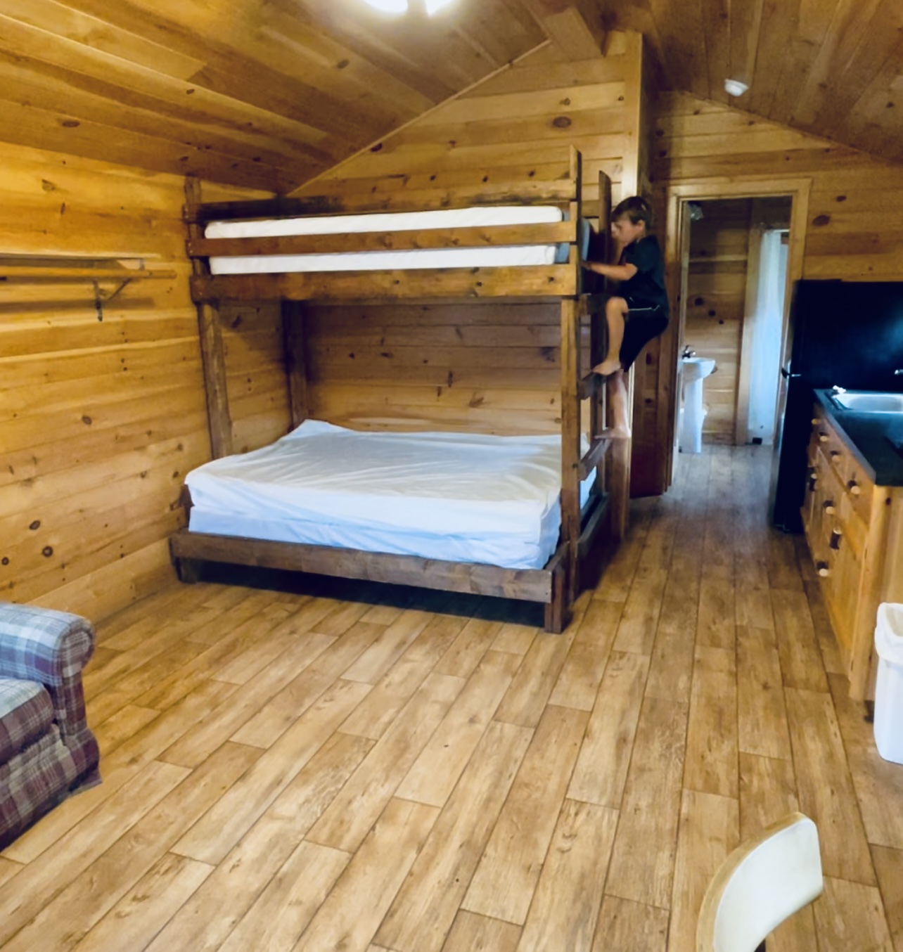 This is a big campground with a long row of cabins and 8 long rows of RV sites. The cabins were good for families with bunks and had private bedrooms for mom and dad. We had a cabin with bathroom and kitchen, front porch, side fire pit and picnic table. It was close to the pool and short walk to the amenities. The manager, Bryan (who does a great job!) said they are adding new deluxe cabins next year. We think they will be a great new addition to the campground for those that don’t own RV’s.