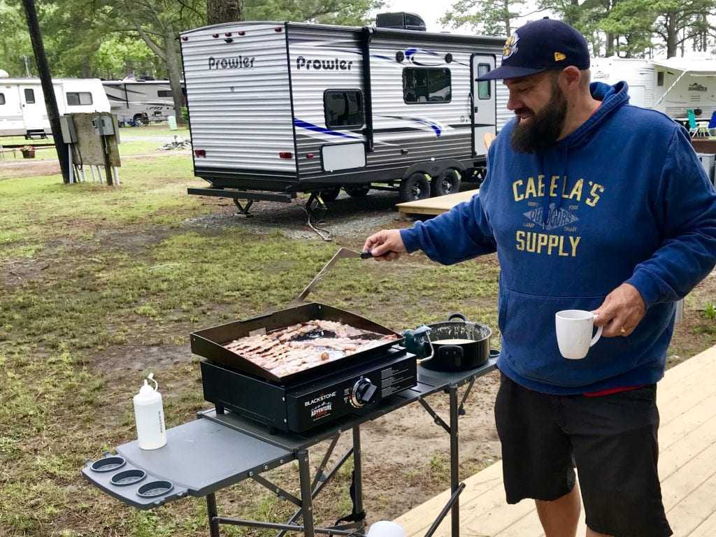 The Blackstone 17 inch portable griddle has been one of the hottest RV and camping accessories for the past 2 summers. The combination of the 12,000 BTU H-Style Burner and the Cold Rolled Steel Griddle Top delivers even heat on every inch of cooking space. The 17 inch is a breakfast bad boy, but can also be used for lunch and dinner. We recommend the 17 inch for three people or less. If you have four or more in your camping party we recommend that you step up to the Blackstone 22 inch. Both are now available with Blackstone’s legendary integrated grease management system.