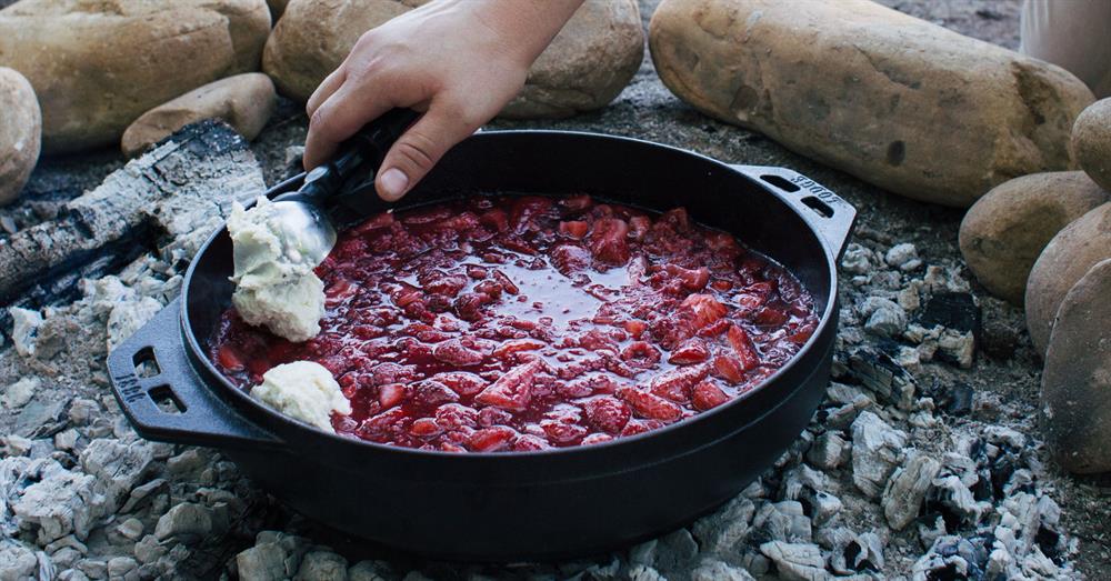 - When berries are bubbling, remove dome and scoop the cobbler mixture onto the berries. Place flat piece back onto the cobbler and cover evenly with coals for medium-high heat.