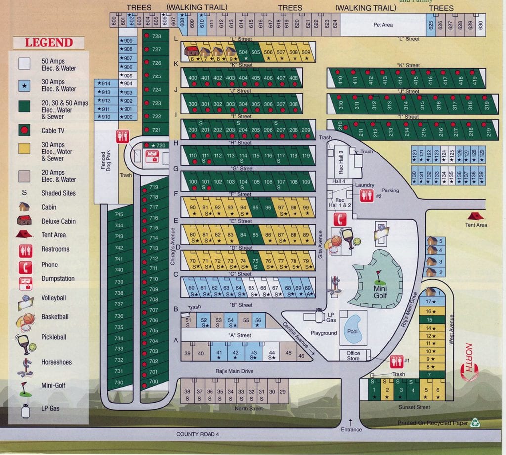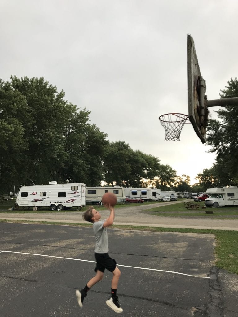 We highly recommend the full hook up sites towards the back left corner on the map pictured above. Sites in the 90-119 area would be our other pick. (You can see those sites pictured in the basketball shot below.) Personally, we would avoid the sites in the back right area of the map. There is an RV service center located right next door and it felt more industrial and commercial on that side of the campground.