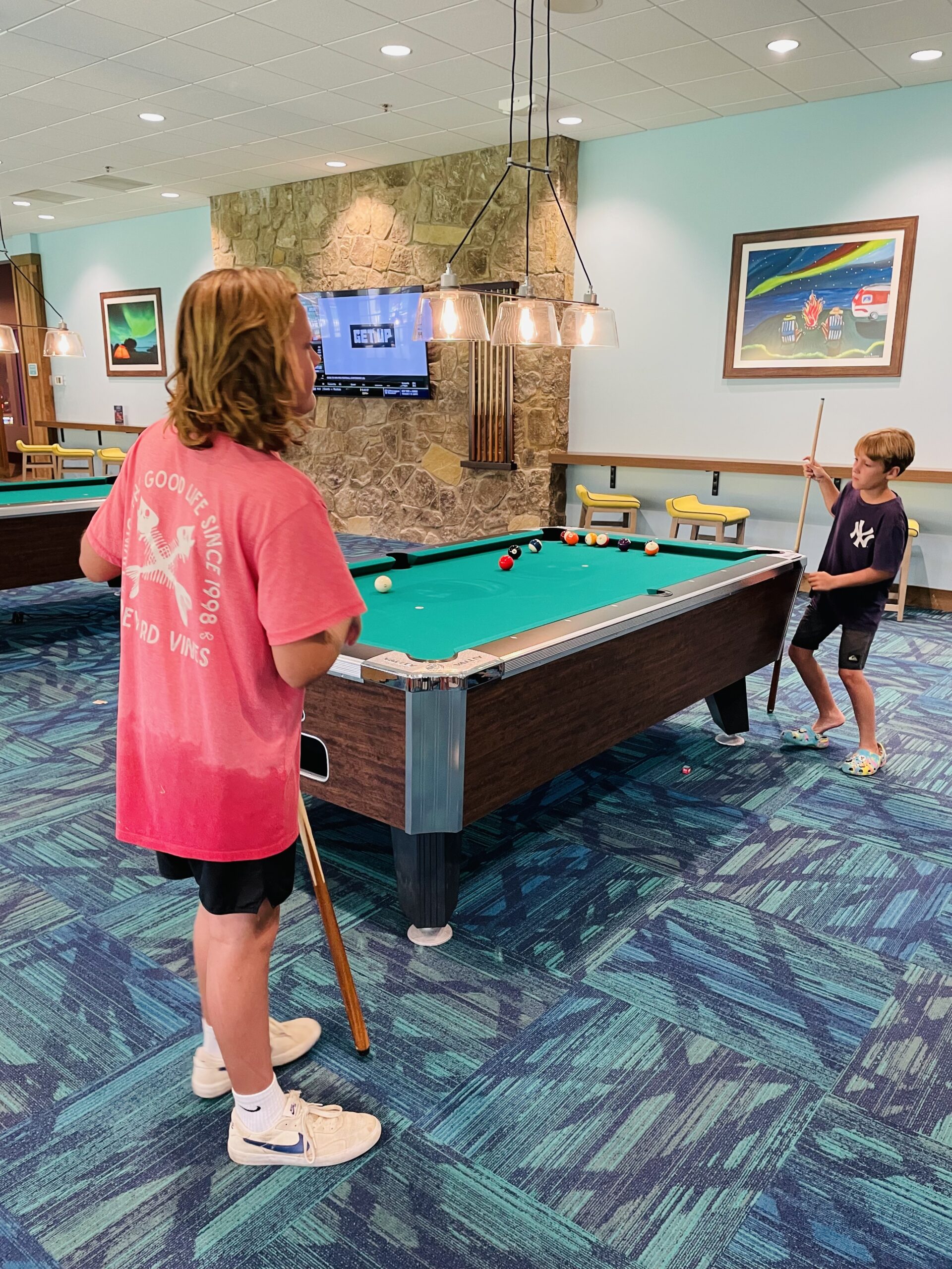 Overall, the recreational options at this property are excellent. We loved the brand new pickleball courts and appreciated being able to play under the lights. These courts are located at the front of the lodge, just a few steps away from where the RV sites begin. There is also a corn hole game set up right outside of Fins Bar & Chill in the front of the building near the pickleball courts. Your kids can burn some time here while waiting for dinner to be served . You can keep an eye on them while they play because Fins has huge garage doors that get opened up during operating hours.