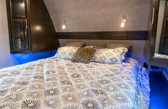 We ditched the dinette in the toy hauler and never looked back, so we loved the option to have a chase lounge in the main living area. We’ll add extra chairs and foldable tables to make the space flexible and easily transformed for different purposes. We are, quite frankly, thrilled to have an electric fireplace and large television. No, we’re not roughing it. (Sorry/Not sorry)