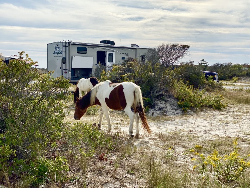 For us, this was the perfect way to test our new rigs off the grid capabilities. Now I know that Assateague is not really “off the grid,” but the site we booked had no hookups and it would give us the chance to see if luxurious dry camping was possible in our new Eagle. We wanted to test out all of our new systems, options, and modifications, and gosh darn it, we wanted to do it with wild ponies grazing next to our campsite.