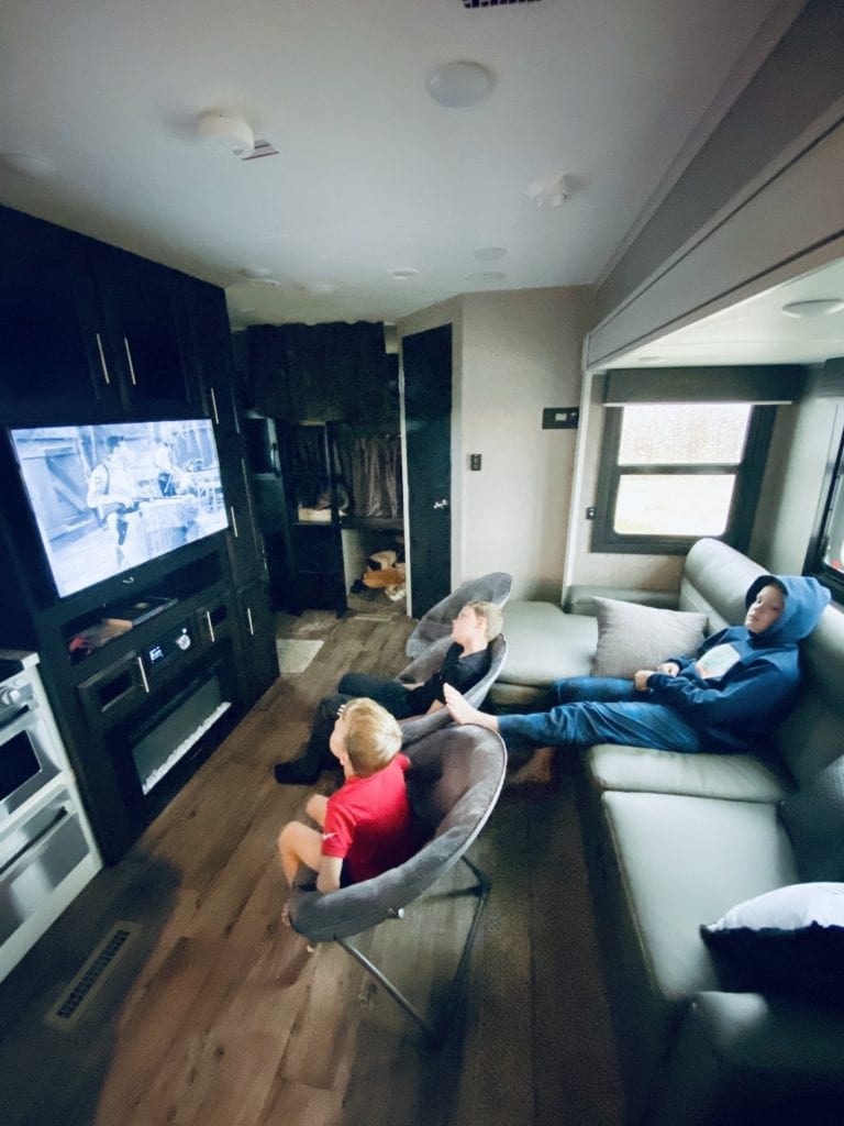 The single Chaise lounge without a dinette or an additional sofa also has our podcast listeners asking some questions. Namely, where will everyone sit!! It took one trip to Target to sort that one out. Stephanie picked up three cute and cozy folding chairs that can easily be stored under the master bed when not in use. So much winning on our first trip! Somehow or another we have ended up with more comfortable seating than we have ever had in an RV.