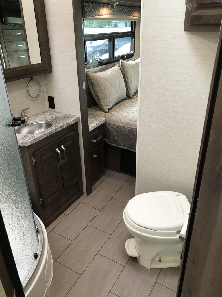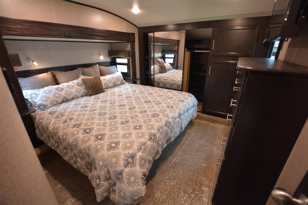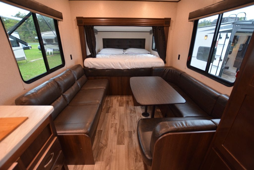 The White Hawk 32KBS impressed us on several fronts. The main living area is spacious and comfortable, with ample counter space for food prep and appliances. But the real show show stoppers appear at the front and back of the rig. The rear bathroom in the White Hawk has an absolutely gigantic walk in wardrobe that makes this Hawk perfect for long term travel or seasonal camping. The sofa and large front window in the bedroom also makes this rig more comfortable and well lit than most residential bedrooms. If you want a spacious RV that feels like a home, but don’t want to move up to a fifth wheel, the 32KBS might be just right for you.