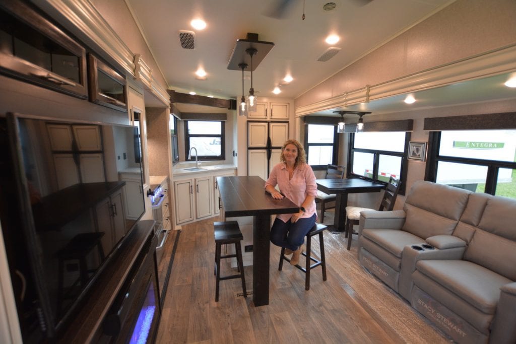 This Seismic fifth wheel toy hauler with a raised kitchen had us at hello a few years ago when we first stepped inside at the Florida RV SuperShow. There’s a couple of updates that have brought the floor plan back into the spotlight. First of all, they removed the half bath in the garage to gain more space in the living area and add a freestanding table and chairs. We really appreciated how this change up created a more residential and cozy feel in the living area.