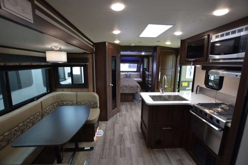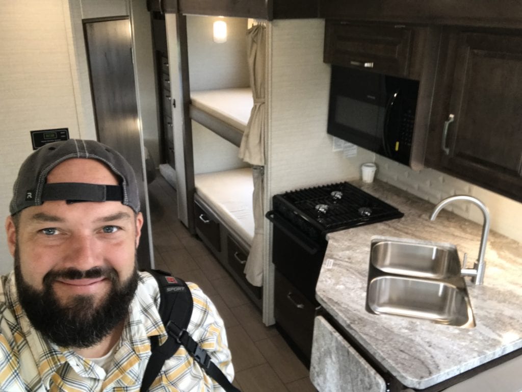 First of all, it removes the dinette from behind the passenger seat, making for more room to recline while in transit. It also opens up the kitchen area and creates extra counter space. We’ve always hated the stove range right next to the couch on that traditional floor plan, and this removes that awkward positioning. By placing the bunks on the driver’s side of the rig and eliminating the slide on the passenger’s side, this bunkhouse C is able to offer a significantly larger awning–one big enough for the entire family. The downside is a slightly more narrow hallway entering into the master bedroom, but we’ll take that any day.