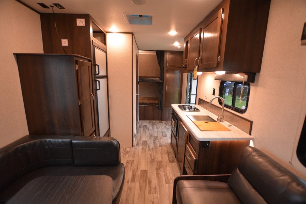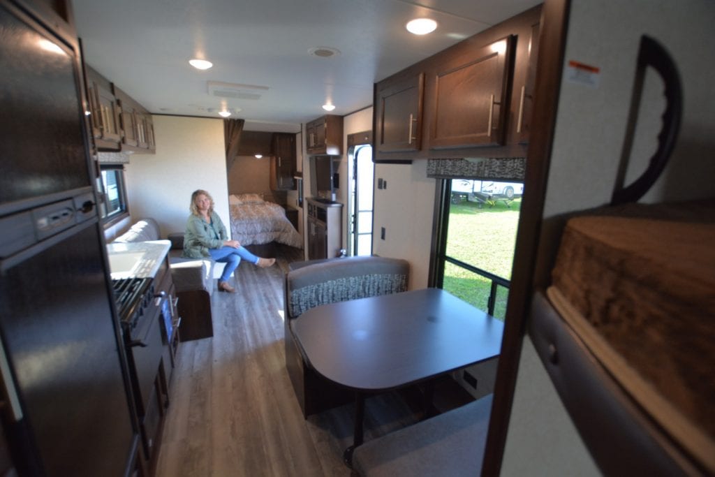 The SLX line within the Jay Flight brand offers simplified, lightweight travel trailer options. The 298BH is just under 32 feet with a dry weight of 5,105 pounds and about 1,000 pounds of cargo carrying capacity. What’s different about this double over double bunk option? It has no slides, which keeps the trailer weight down. And the floor plan layout creates a ton of open space along with distinct kitchen, dining, and seating areas. Most notably for some will be that the couch is directly across from the entertainment center. This eliminates the neck craning that is a pet peeve of many RVers. The outdoor kitchen is an additional bonus in the lightweight travel trailer that we were happy to see.