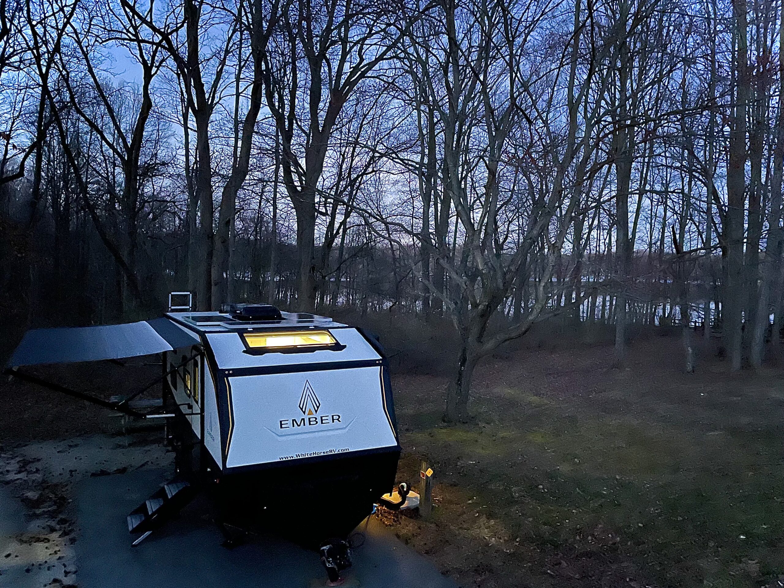 Lums Pond State Park ended up being the perfect place for an overnight stop. It was less than 1.5 hours away from my dealer, and then it would be an easy two hour tow down through Delaware to Assateague. Lums was really beautiful and it offers full hookups at state park prices. I pulled in an hour or two before dark and got everything out of the truck and into the Ember Overland 191MDB. My site was also really nice with lots of space on either side.