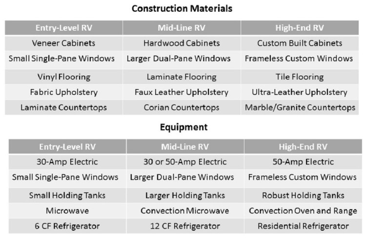 Mark breaks RVs up into three categories: Entry-Level RV, Mid-Line RV, and High-End RV. He goes into a ton more detail on the categories in this blog article, but here is the chart that we reference on the podcast: