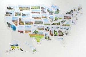We are in love with this US Travel map made by watercolorist Rachel Alverez who hales from the Eastern Shores of Maryland. It departs from the bold, primary colors of most tracker maps. Instead, you’ll find gorgeous, original watercolor paintings for each state. Rachel Alverez has a ton of other products that feature these watercolors. You can buy prints or stickers of individual states as well.
