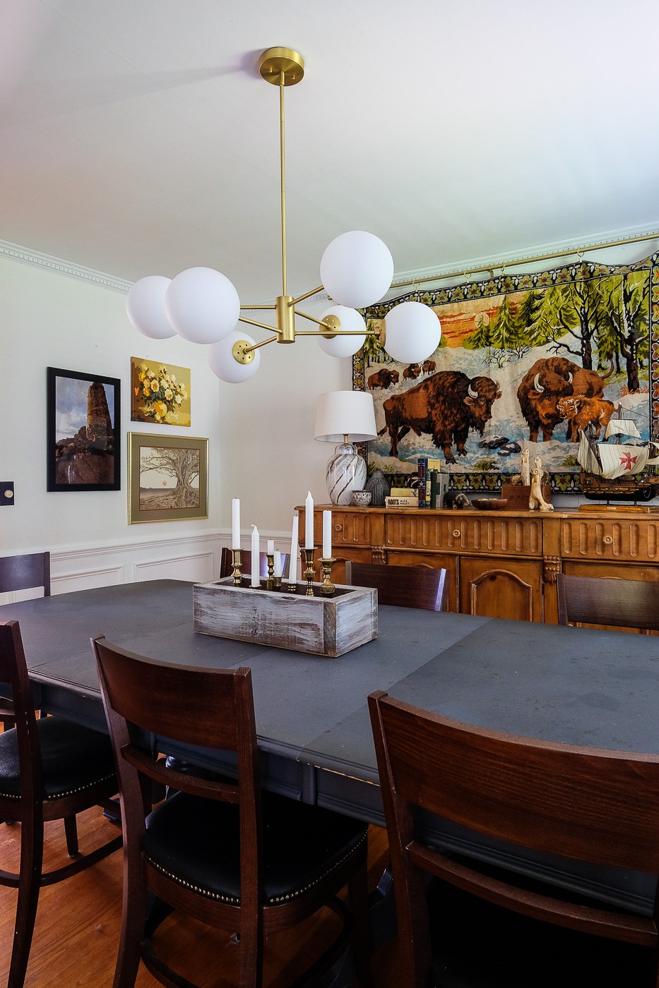 Most of these tips are about tucking little reminders of your travels here and there throughout your home: a tasteful figurine on the bookshelf or a vintage poster in a grouping of artwork above your sofa. But if you happen to have a kid who shares your affinity for travel-related decor (or is too young to protest), it’s a perfect opportunity to unleash all of your inner sense of whimsy. When we were decorating a “big kid” room for my youngest, we did a full national parks theme, complete with prints from Creative Action Network’s See America project, an NPS arrowhead logo-shaped chalkboard, bison-stamped curtains (we have a lot of bison around here), and a bookshelf lined in fabric with a cool mountain print.