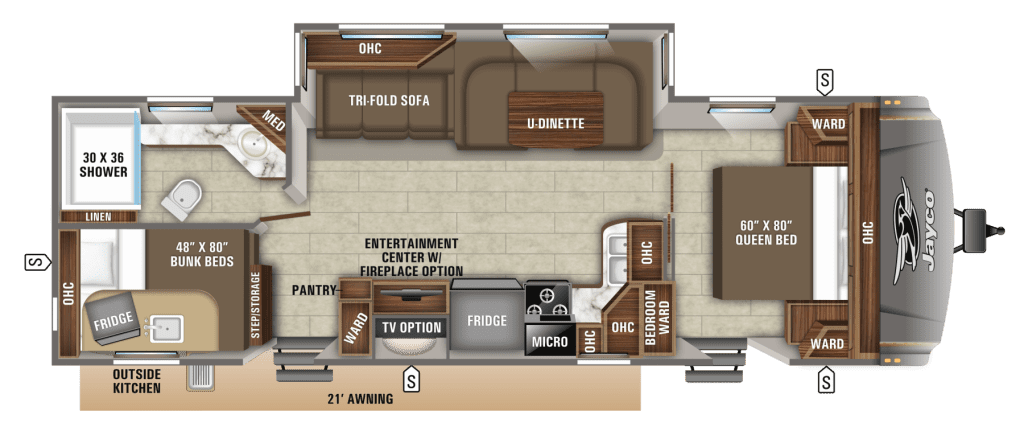 Will the RV Atlas crew end up in a Jayco Eagle HT one of these days? We must admit, the Jayco Eagle HT 264BHOK and 284BHOK have captured our attention. The 264BHOK was the “Family Friendly” category winner at the RVX Reveal in Salt Lake City this past winter. It’s easy to see why this particular floorpan wowed the judges at RVX. It wowed us too. For a rig that clocks in at just under 33′, with a UVW of 7410 lbs. it packs in a ton of features and amenities–with very few compromises.