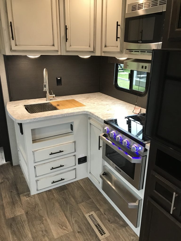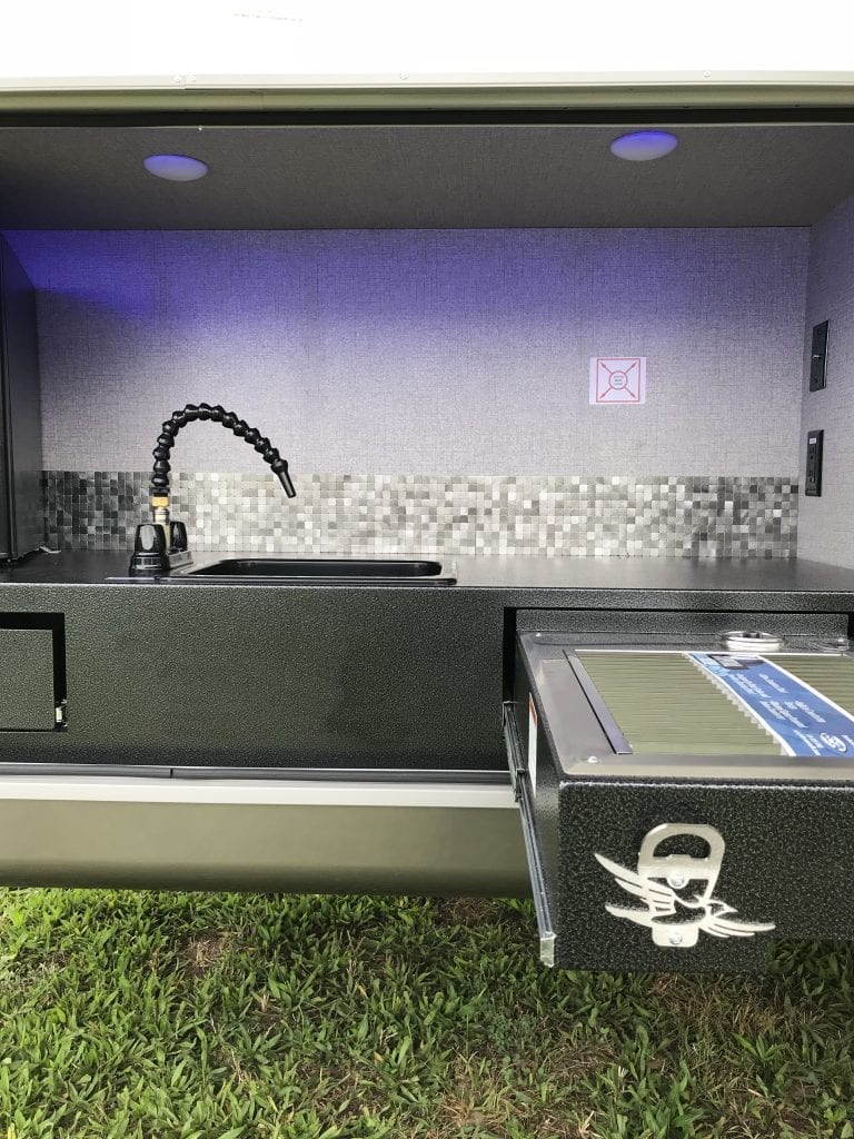 The outdoor kitchen on this Eagle is also ridiculously nice. Build quality will survive the zombie apocalypse and there is plenty of counter space for meal prep and additional appliances like a coffee maker. You could also mount a TV here if that is your thing. Because of the drop frame chassis this outdoor kitchen is easily reachable for campers of any height. We have seen a few seasonal campers build semi-permanent decks because their outdoor kitchens are so high off the ground. Not a problem on this Eagle. Not even close.