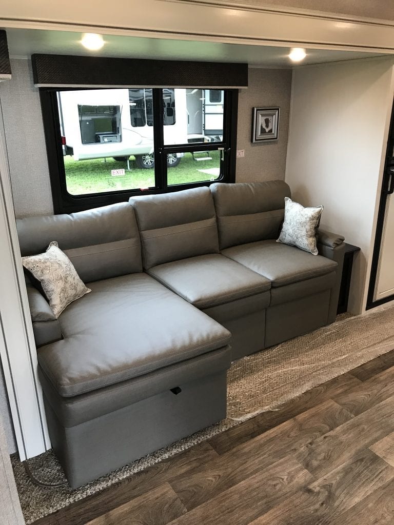 We are not huge fans of the U-Shaped dinette here at the RV Atlas. We think that they are actually more cramped and uncomfortable than booth dinettes. But the U-Shaped dinette is mischievous and deceptive! It tricks the RV shopper into thinking it is more spacious than its booth counterpart. But to be honest–we don’t really like having a dinette table inside an RV at all. We almost always eat outside. When we eat inside we use dinner trays on our laps. It works well for us even though some of you might think we are crazy. So we REALLY love the chaise lounge option in this Eagle–we would choose this over the U-Shaped dinette any day!