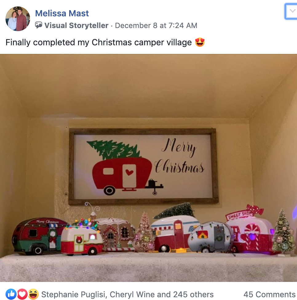 4. The “Christmas camper village” post. One of our favorite holiday traditions is the annual roundup of RV holiday ornaments and decorations. Melissa Mast’s post was full of Christmas camper cheer!