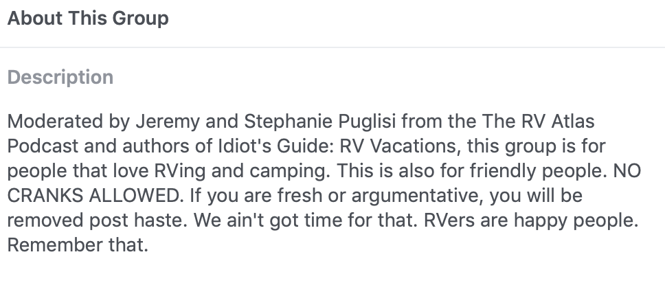 How do we keep our group so friendly? Honestly, we just nip the negativity in the bud whenever we see it. So, play nice! This group is here to help members support one another. No need to get snippy while discussing black tank maintenance or tow weights. We believe in this mission so much we state it right upfront: