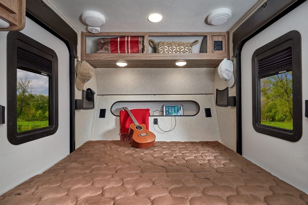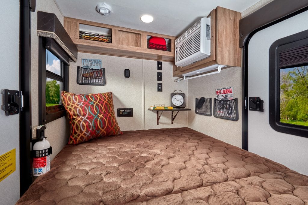 John Fisher: The 10RK has a standard Fantastic Fan powered roof vent, which can really move a lot of air. We also offer an 8,000 BTU side-mount A/C for those customers that want their unit to be nice and cool!! The 10RK has a standard Furrion Lit portable Bluetooth speaker mounted inside, so you can stream music inside or outside the coach and it also has a TV bracket and hook-ups in the interior and a standard 2-way (12V/120V) 24″ LED TV in the rear exterior kitchen. Interior overhead storage cabinets, multiple cargo nets, retractable cup holders, a nice size cubbie area at the head of the bed & USB and 110 recepts make the interior well-appointed.