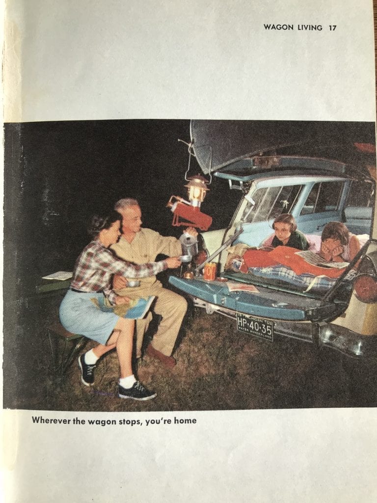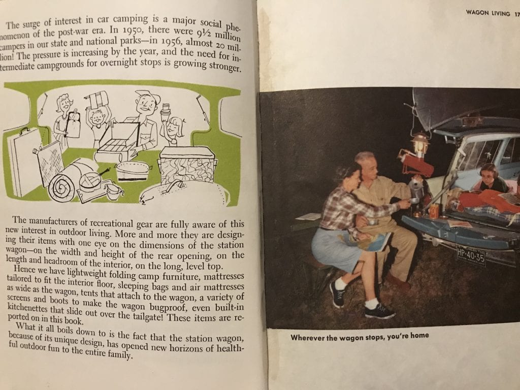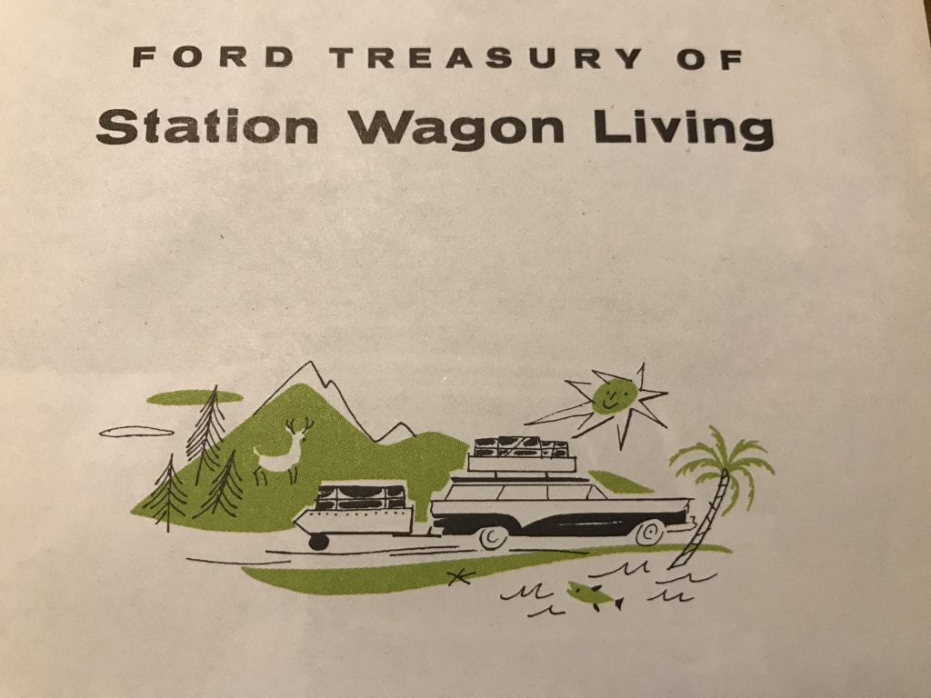 Every year more and more people take to the outdoors as they discover the fun of driving away on picnics, fishing trips, outings, and vacations. This compact, handy book of 256 pages is just the right size to fit into the glove compartment of your car. It is crammed with illustrations and information about the variety of equipment and accessories now available that can transform the family station wagon into a combined hotel and hunting and/or fishing lodge.  –Ford Treasury of Station Wagon Living